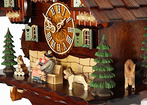 A cuckoo clock with a typical Black Forest house called Fidelis Courtyard. It has a shingled roof and attic windows. The couple kisses romantically in time to the cuckoo call which is once on the half hour and on the full hour according to the time. Two alternating melodies – Edelweiss and Happy Wanderer – play every hour while the water wheel turns and the figurines wearing the Black Forest costume dance around to the music. The clock is personally signed at the back by the manufacturer Adolf Herr . His signature guarantees the experience of 7 generations of clock-workmanship. This clock comes with a certificate of authenticity (AHC). Clock Movement: 8-Day(weekly wind-up) Regula rack strike movement with night off. Clock-Face: HerrZeit Wooden dial, diameter 4 Inch (10 cm), with wooden hands. Dancing Figurines: Handcarved and handpainted wooden couples in Black Forest costume. Pendulum: HerrZeit bolt pendulum with fine adjustment. Musical Movement: musical movment (22 tones) with two different melodies (Edelweiß & The Happy Wanderer). Chime: Diameter 4,7 Inch (12cm), burnished Cuckoo-Bird: HerrZeit cuckoo bird (handcarved). Color: walnut dark. Publication Year: 2001 Designer: Juergen Herr