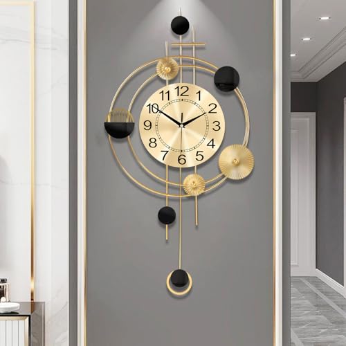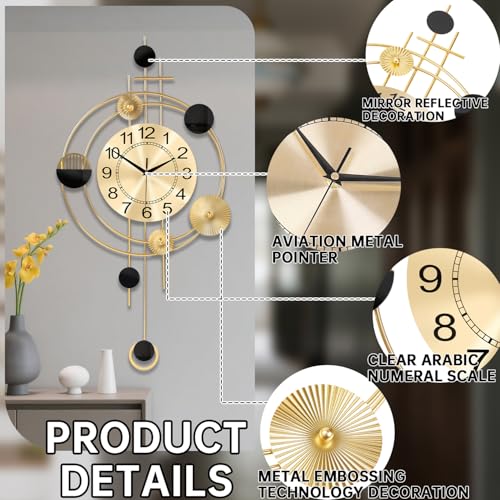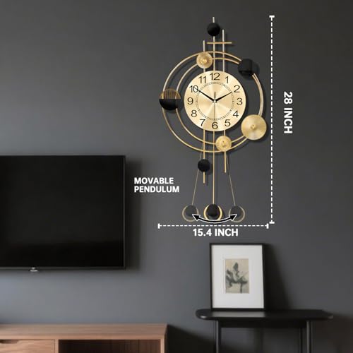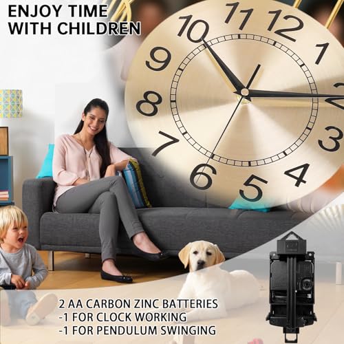 Wall Clock with Pendulum, Silent Quality Quartz Battery Operated, Round Analog Large Wall Clock for Living Room Kitchen Bathroom Bedroom Wall Home Decor, 15.4x28inch, Golden