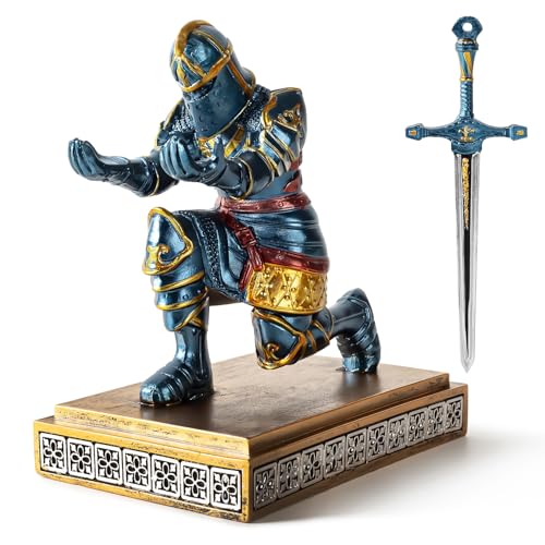MACLARONX Kneeling Knight Pen Holder with Sword Medieval Warrior Fancy Pencil Stand for Office Desk Home Decor for Men Father Husband Armor Soldier Statue