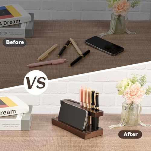 Specification: Wooden Pen Holder for Desk, Wood Pencil Holder Fountain Pens Display Stand with 9 Slots and Phone Holder, Stylish Office Desk Decor, Pen Organizer for Office, Home