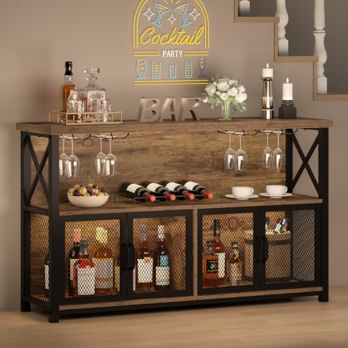 LVB Industrial Coffee Bar Cabinet, Farmhouse Wine Bar Cabinet for Liquor and Glasses, Metal Wood Sideboard Buffet Liquor Cabinet and Wine Rack with Storage for Home Dining Kitchen, Rustic Brown, 47 In
