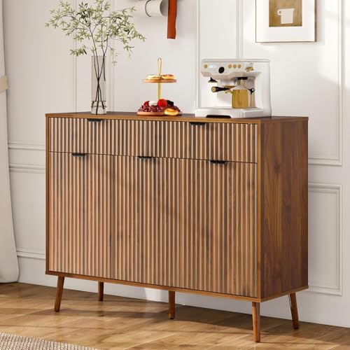 LYNCOHOME Fluted Sideboard Buffet Cabinet with Storage,2 Drawers and 3 Doors,Wood Coffee Bar Cabinet with Solid Wood Feet for Kitchen,Hallway