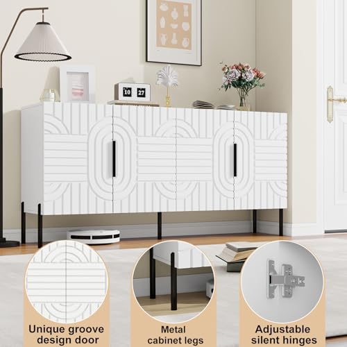 Specification: White Buffet Cabinet with Storage: 63″ Fluted Sideboard Cabinet with 4 Doors, Wood Credenzas for Living Room, Mid Century Modern Sideboard Cabinets (White)