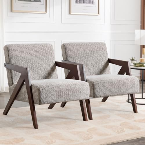 Bonzy Home Mid-Century Modern Accent Chair Set of 2 with Solid Wood Frame, Upholstered Armchair for Bedroom & Living Room,Reading Side Chair with Soft Lien Fabric Cushion,Easy Assembly,Beige