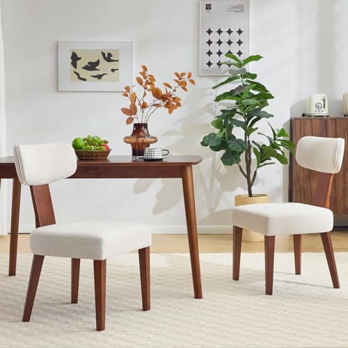 Dining Chairs Set of 2, Mid-Century Modern Upholstered Kitchen Chairs with Curved Backrest and Linen Fabric Seat, Wood Leg Accent Chairs for Dining Room, Living Room, Bedroom, Linen Beige