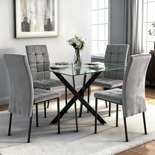 5-Piece Square Tempered Glass Dining Table Set for 4, Cross Metal Leg Modern Kitchen Table Set with 4 High-Back Velvet Upholstered Chair for Dining Room, Apartment(Grey Chair)