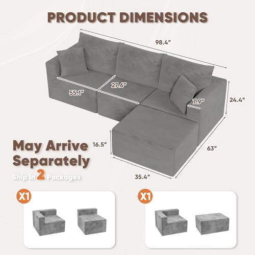 Specification: JUMMICO Boneless Couch with Deep Seat and Ottoman, Modular Sectional Sofa with Body Support, Corduroy Couches for Living Room, Apartments, Bedroom, No Assembly Required (Gray, L-Shaped)