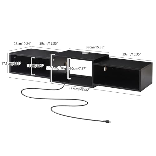 【CABLE MANAGEMENT】Still worrying about messy wires when putting a TV? Our wall mounted TV shelf has the hollowed holes specially designed to hide messy cords inside the stand so that your belongings are organized. floating TV cabinet also come with a recessed power strip, inside features 4 standard plug outlets for which you can charge your TV, DVD, WiFi router and etc.It makes everything look neat!