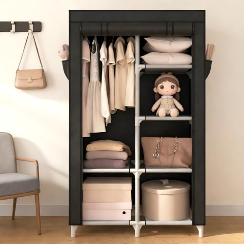 SPACIOUS WARDROBE: The portable closet has five compartments and one hanging area. The 5 storage shelves are perfect for storage items such as clothes, handbags, hats, and storage boxes. There is a large space in the hanging area for clothes that are long or easy to be creased. Besides, the portable wardrobe is designed with 4 side pockets to store small objects, like towels, scarf, or socks. It adds more storage space for all your clothes and accessories and makes your home neatly organized.