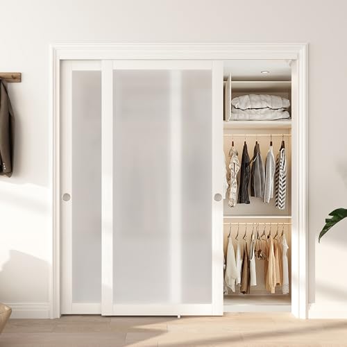 Sliding Closet Door 72″(Double 37″) x 80″, Full-Lite Frosted Glass Closet Door with Hardware Kit & Matching Fascia, Sturdy Solid Wood & MDF with Water-Proof PVC Surface, Pre-Drilled