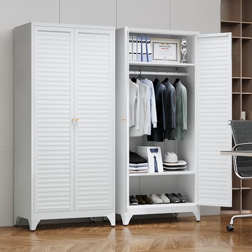 SteeLoong 71″ Metal Wardrobe Cabinet with Hanging Rod, Armoire Wardrobe Closet with Doors and Adjustable Shelves, Whiet Clothing Storage Cabinets for Bedroom Office,School,Hospital