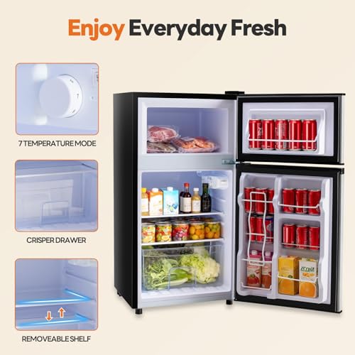 Specification: 3.2 Cu.Ft Mini Fridge with Freezer, 2 Door Small Refrigerator with Adjustable Thermostat Energy-efficient Low Noise, Compact Fridge for Bedroom, Office, Dorm, Black