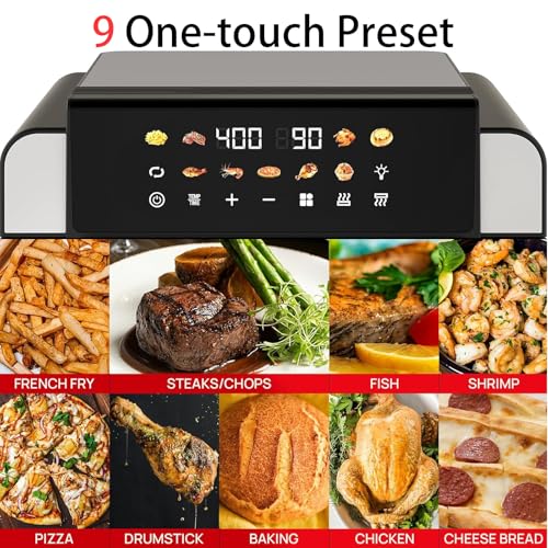 【9 One-touch Presets】This toaster oven air fryer combo cooks smarter and faster with 9 versatile presets including French Fry, Chicken, Fish, Shrimp, Baking, Meat, Pizza, Cheese Bread and Steaks/Chops. Easily handle daily meals or party favorites with one touch on the digital control panel.