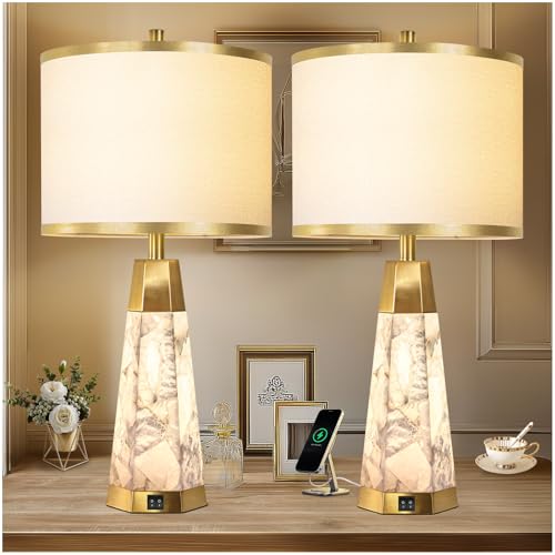 27″ Natural Alabaster Table Lamps Set of 2 – Lamps for Living Room with Night Light, Bedside lamps with White Linen Shade, Nightstand Table Lamp with USB A+C Port for Bedroom Office (bulb included)