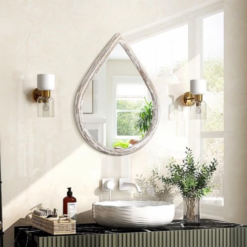 Small Decorative Teardrop Mirror – Rustic White Wood Frame – Farmhouse Hanging Mirror for Wall, Bathroom, Living Room, Entryway, Hallway