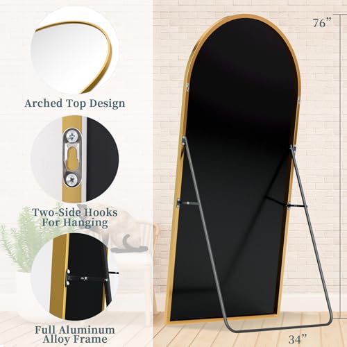 Full Length Mirror with Stand, 76″x34″ Arched Full Body Mirror, Large Stand Up Mirrors, Aluminum Frame Floor Standing Mirrors, Freestanding Hanging Leaning Mounted for Bedroom Living Room, Gold