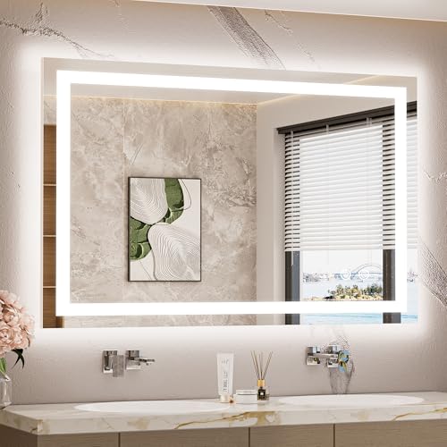 【Versatility and Utility】Our led vanity mirror turns on both the front and back lights with one press. Available in 3000K-6000K warm/natural/white 3 color temperatures to meet your makeup, grooming and ambient lighting needs. The smooth dimming allows you to select your preferred brightness from 10% to 100%. The led bathroom mirror remembers your last settings and offers fast and safe defogging that features an automatic shut-down design for safety.