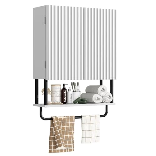 RUSTOWN Fluted Bathroom Wall Cabinet with 2 Doors, 3-Tier Modern Farmhouse Medicine Cabinet, Over The Toilet Storage Cabinet with Adjustable Shelf and Towel Bar (White, Medium)