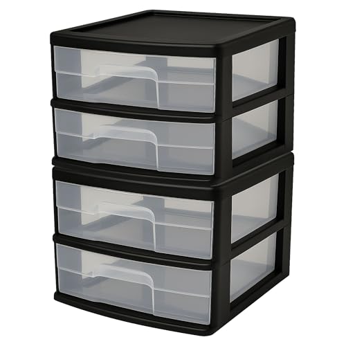 HOMZ 2-Pack 2-Drawer Storage Cart, Clear Plastic Drawers, 14.25″ Wide Medium, Black Frame – Organizing Drawer Containers for Home, Bathroom, Bedroom, Office, and Classroom