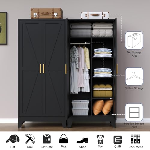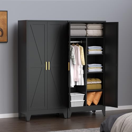 ✅️Large-Capacity Wardrobe: Measuring 17.71″D x 31.5″W x 71″H, this multifunctional metal storage cabinet maximizes every inch of space to meet your extensive storage needs. It features a free-hanging rod for long garments like dresses, suits, and pants, 3 adjustable partition shelves, offering flexible, organized storage for clothes and other items.