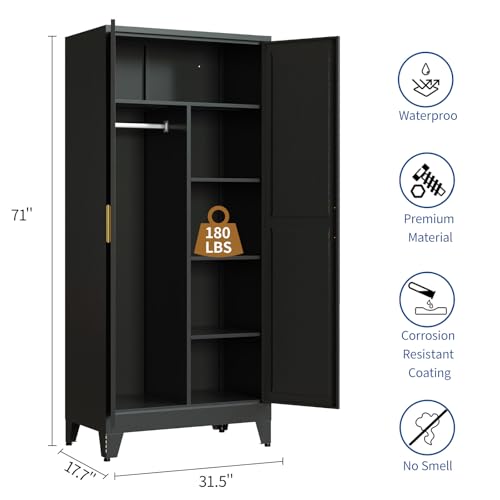 Specification: Steel Armoire Wardrobe Closet, 71″ Metal Clothing Storage Cabinets with 2 Doors & 3 Adjustable Shelves, Black Wardrobe Cabinet with Hanging Rod for Bedroom, Gym