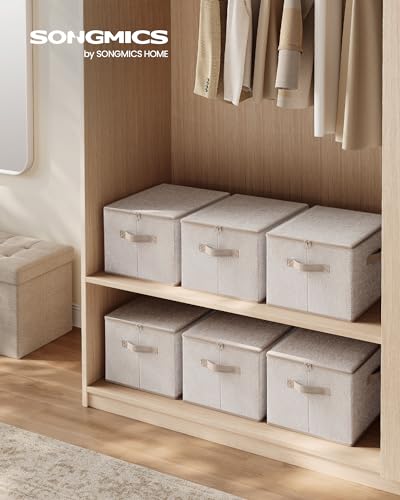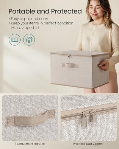 SONGMICS Foldable Storage Organizer Boxes, Set of 3 Storage Basket Bins with Lids, Handles, Clothes Organizer, 15.7 x 11.8 x 9.8 Inches, Non-Woven Fabric, Summer Sand URZB003K01
