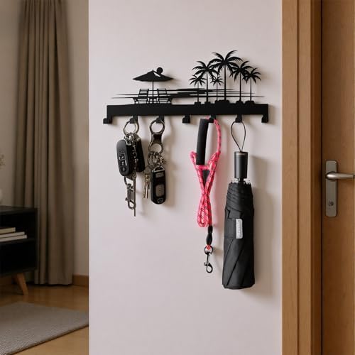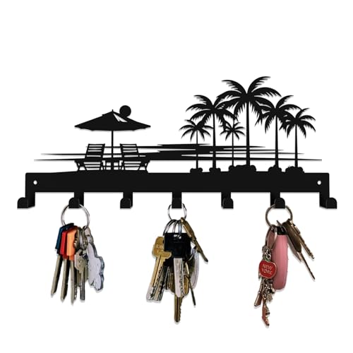 Specification: Tropical Style Key Holder Wall Mount with 7 Hooks, Key Hanger Organizer for Front Door, Hallway, Entryway & Office Decor, Featuring Sunset and Coconut Tree Design