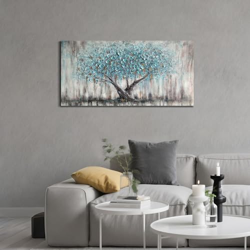 Arjun Tree of Life Wall Art Canvas for Living Room Blue Tree Nature Teal Painting, 50% Hand Painted Textured Picture Bedroom Panoramic Landscape Artwork Framed Home Office Decor 40″x20″