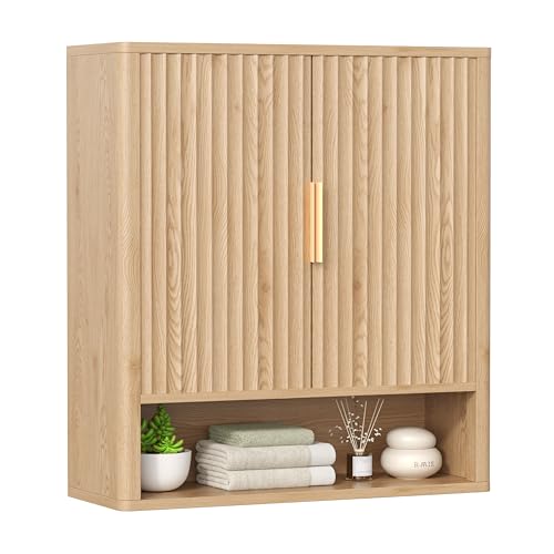 27.6″H Bathroom Wall Storage Cabinet with 2 Fluted Doors, Modern Medicine Cabinet with Adjustable Shelf, Curved Over the Toilet Storage Cabinet for Laundry Room, Kitchen & Living Room, Natural Oak