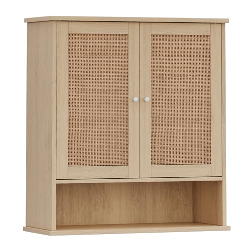 Reettic Rattan Two Door Wall Cabinet, Wooden Medicine Cabinet, Wall Mounted Bathroom Storage Cabinet with Inner Adjustable Shelf, for Bathroom, Kitchen, Entryway, Natural BMGZ103M
