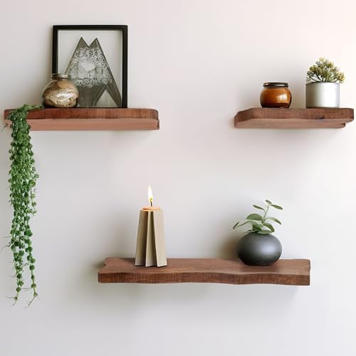 Premium Wood Design: Add natural warmth with these solid mango wood decorative shelves for wall. Featuring a live edge finish and sturdy iron brackets, these set of 3 decorative wall shelves enhance living rooms, bedrooms, offices, or kitchens.